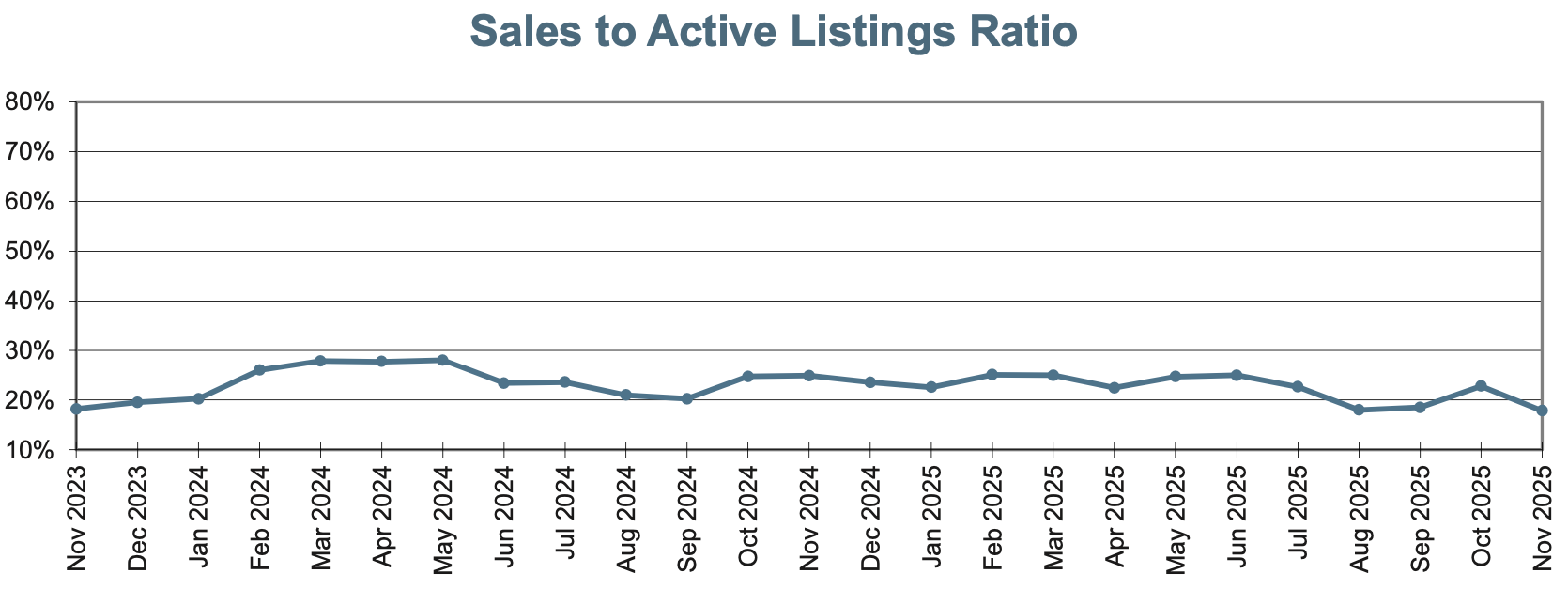 The sales-to-active listings ratio remained within balanced market territory throughout the fall. Conditions continued to favour neither buyers nor sellers decisively. Balanced conditions have been a consistent feature of the market for over two years now, contributing to stable pricing and predictable seasonal behaviour.